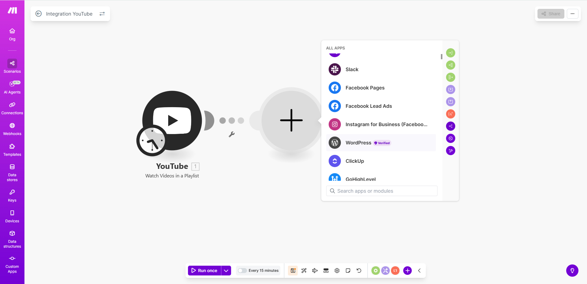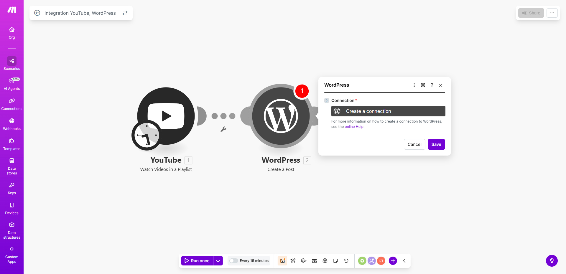 -WordPressの左メニューに現れる「Make」(またはMake Connector)の設定画面を開きます。