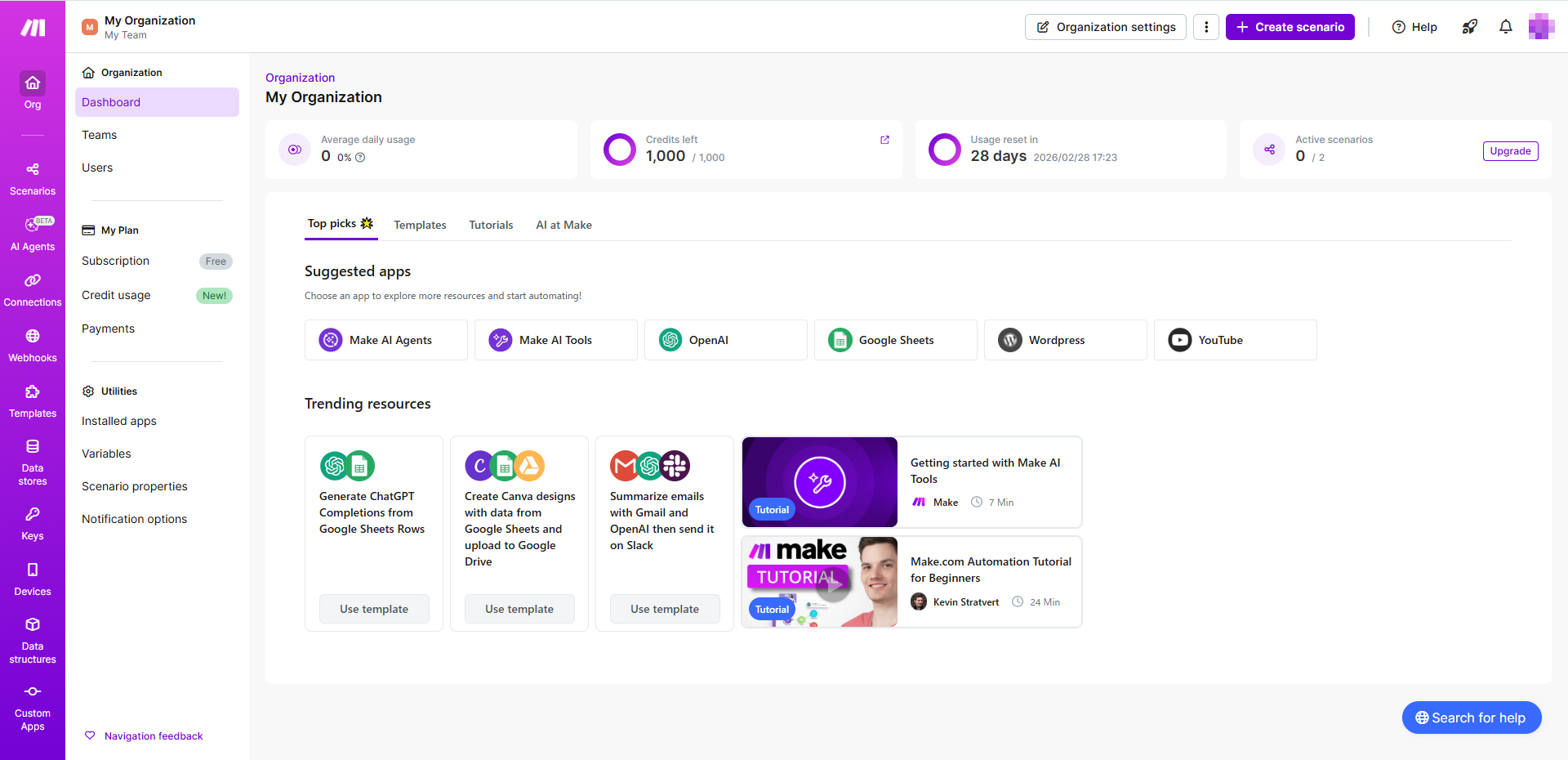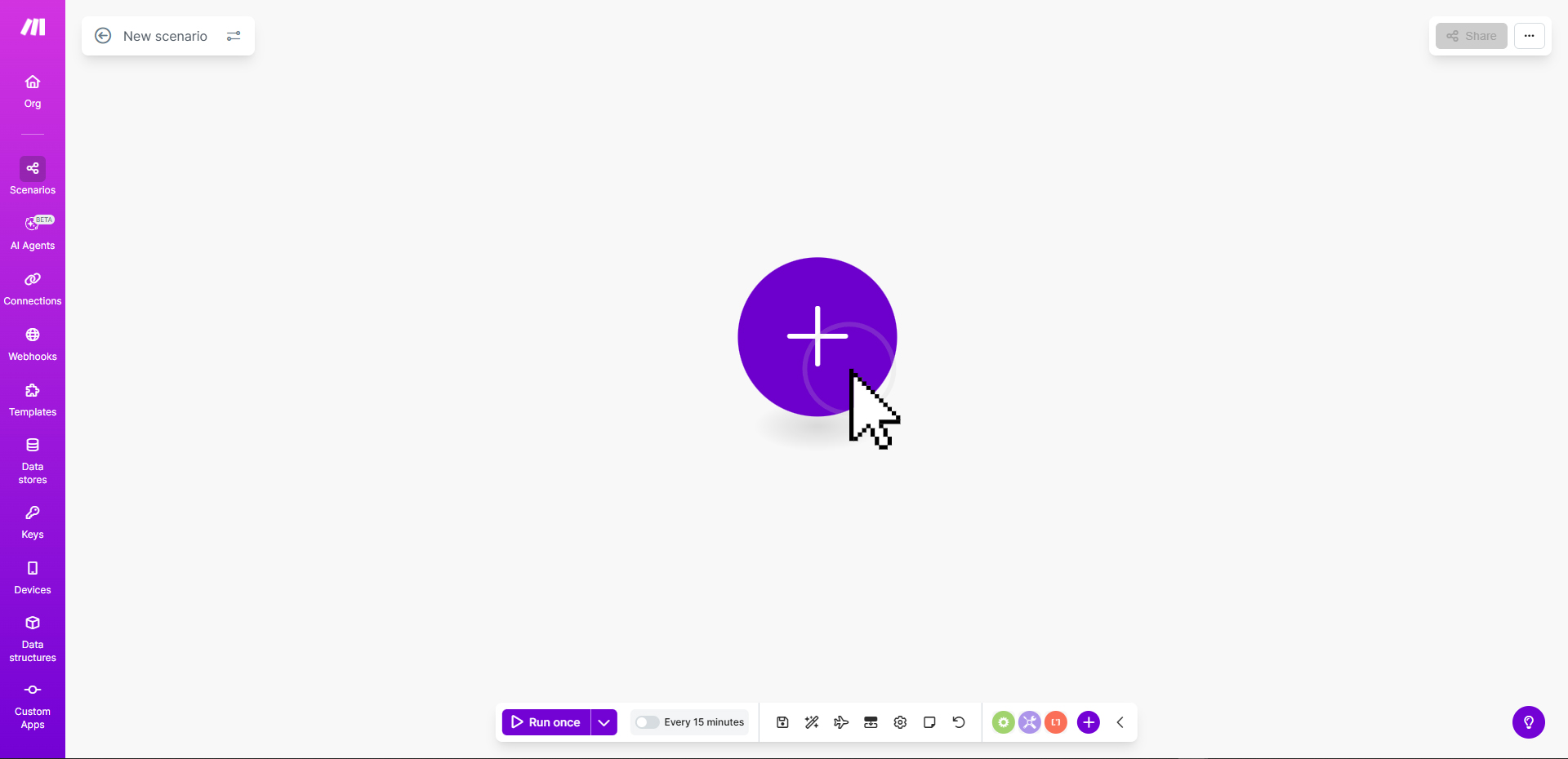 右上の「Create scenario」をクリックします。 すると Automate anything! Let’s begin.のような画面になります。