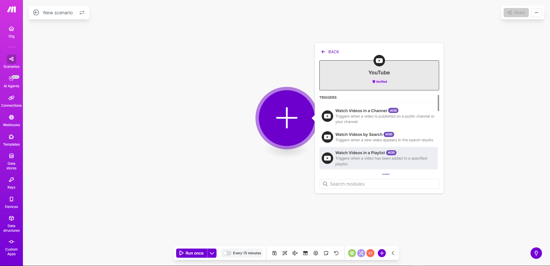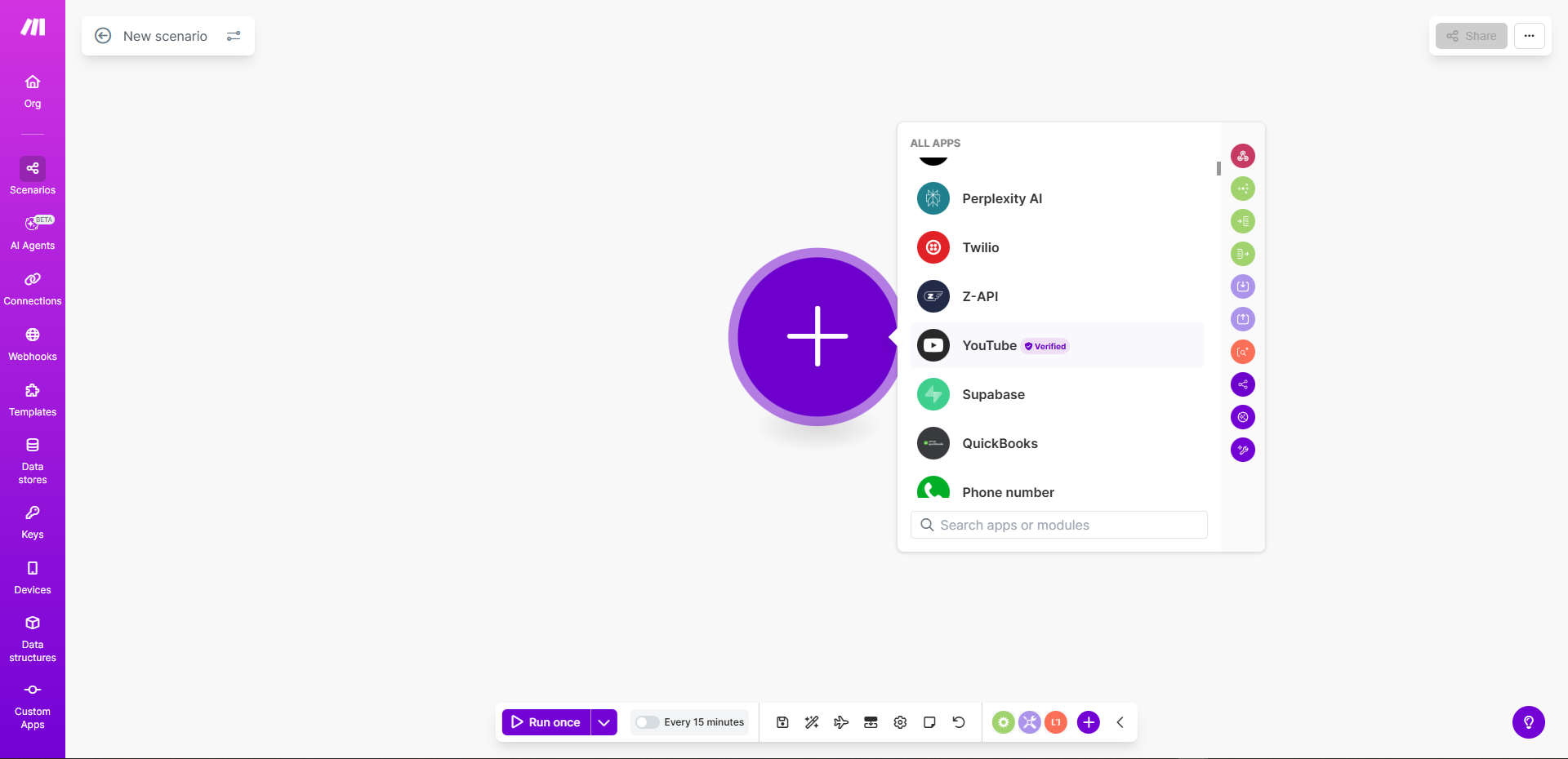 テンプレートを使うよりも自分で「YouTube → WordPress」と繋ぐ方が 今回のようなシンプルな自動化(月30本程度予定)には最適で、余計な設定に惑わされずに済みます。 真ん中の大きい「+」をクリックします。